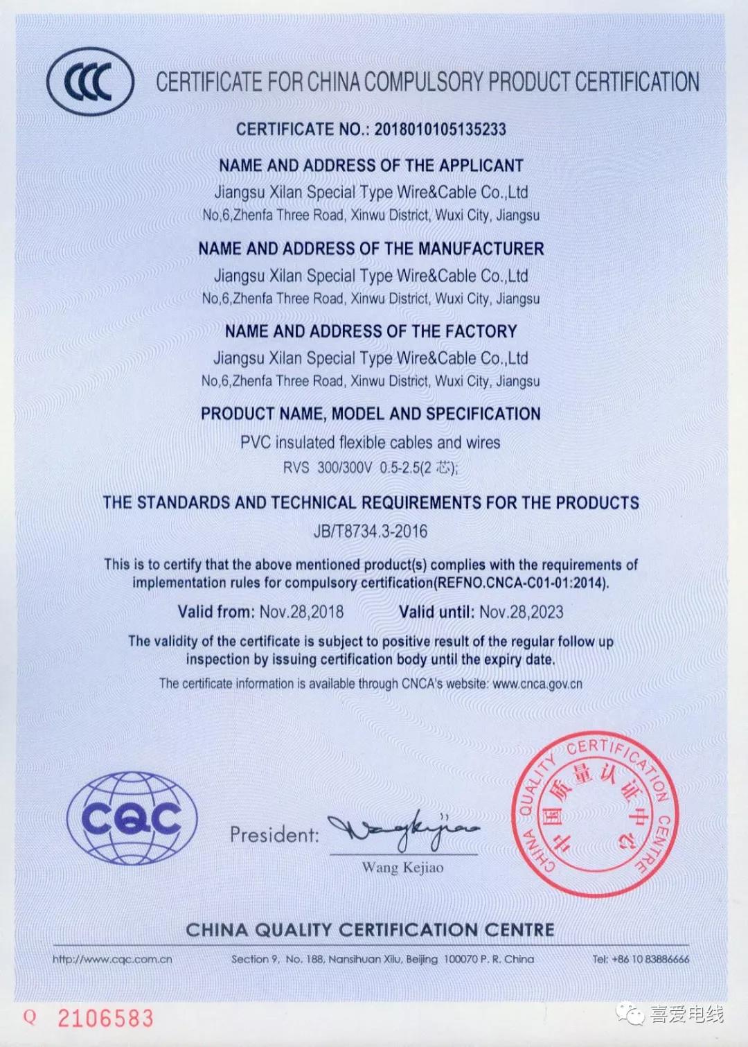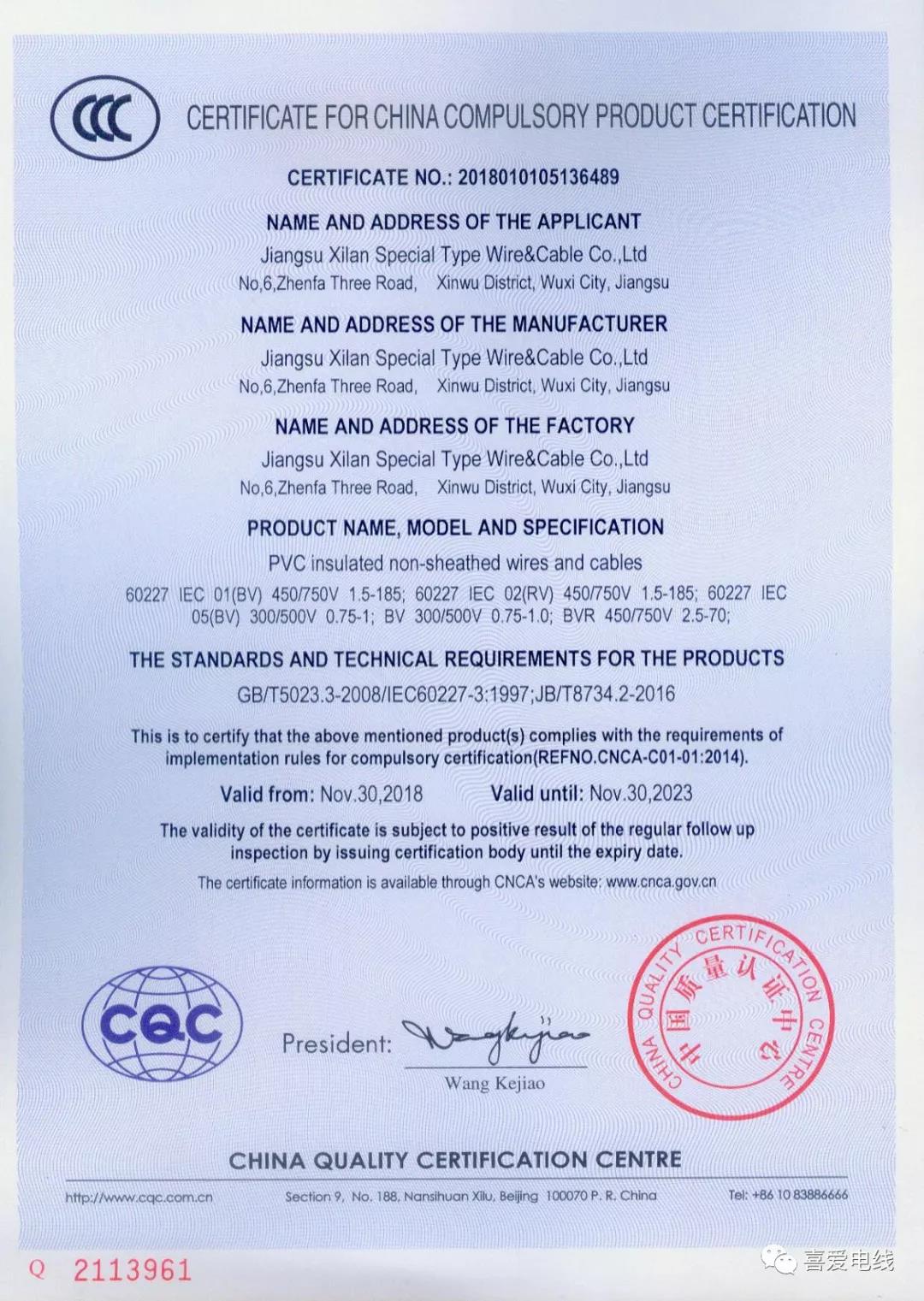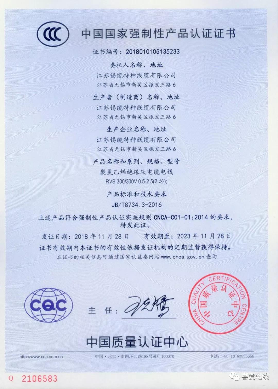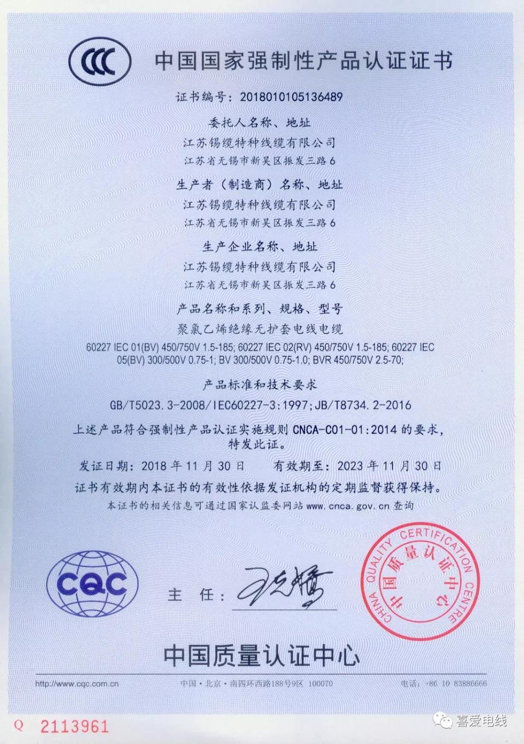 聚氯乙烯絕緣無護套電線電纜認證證書: